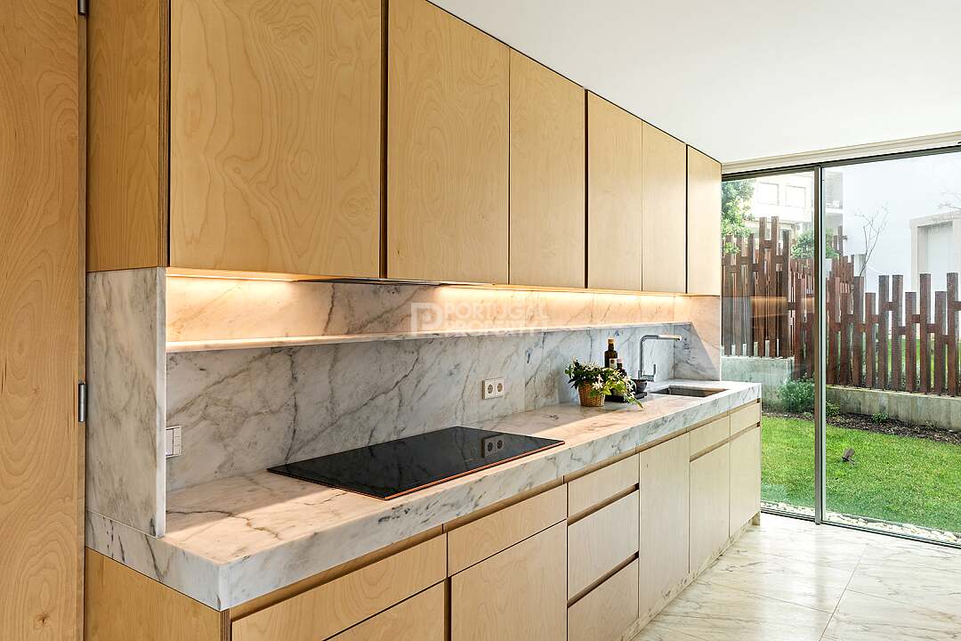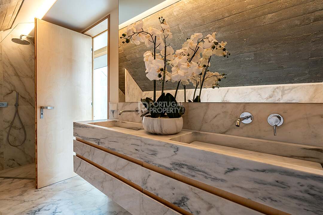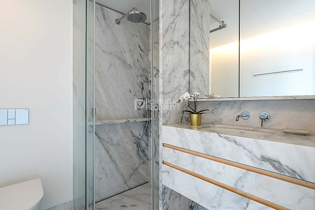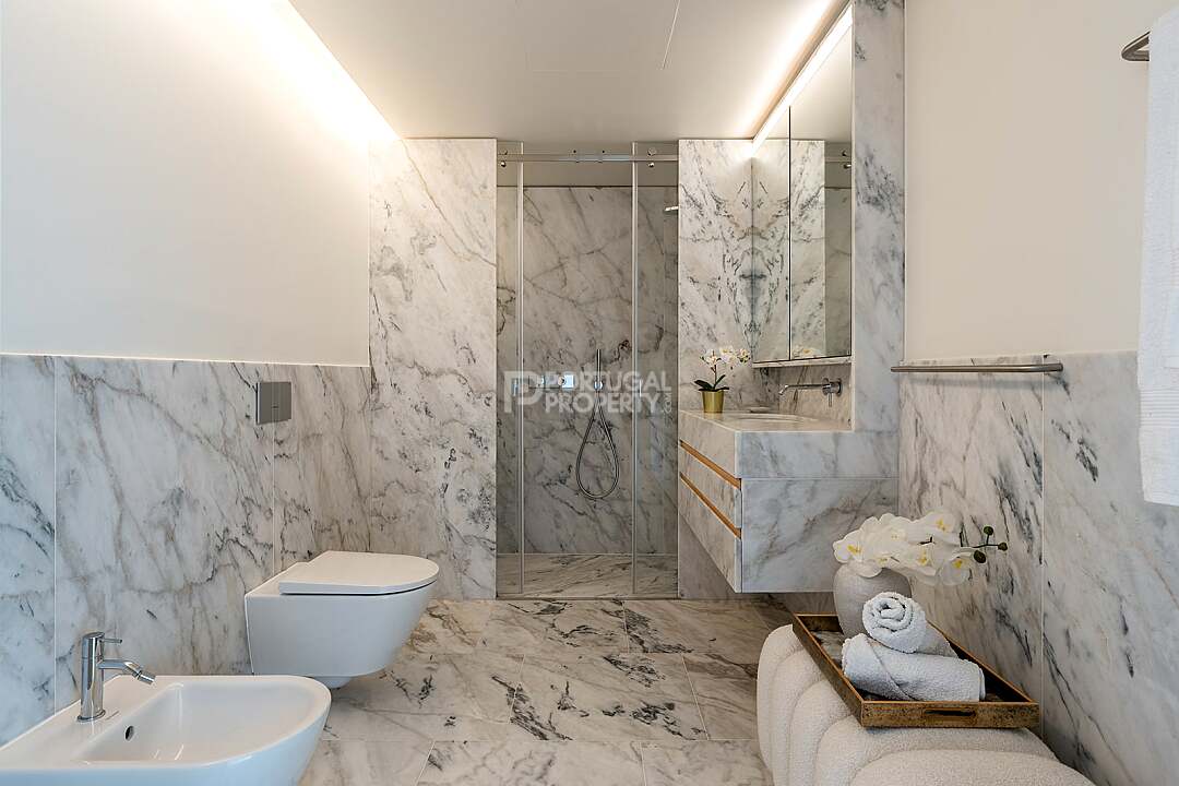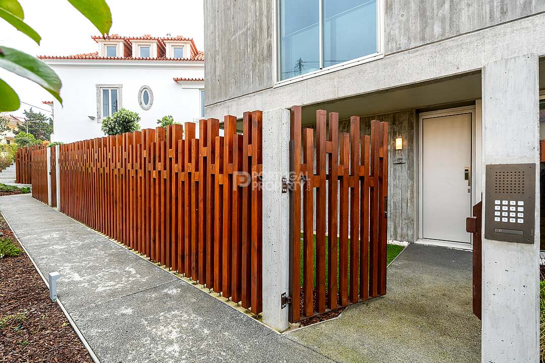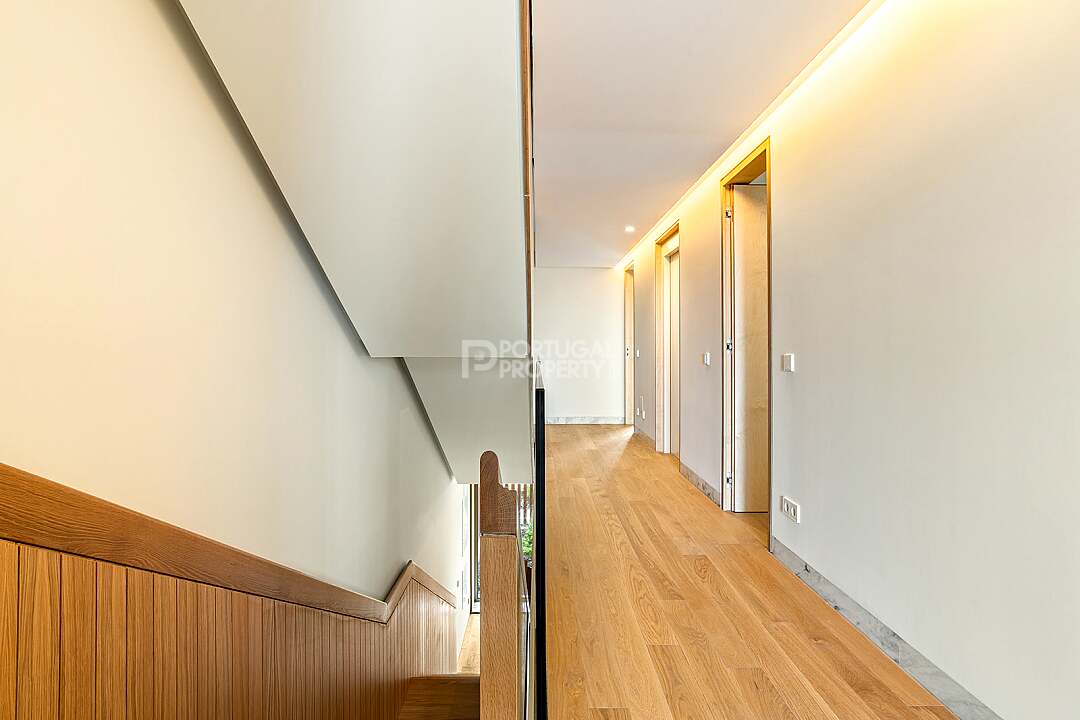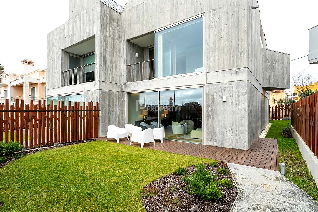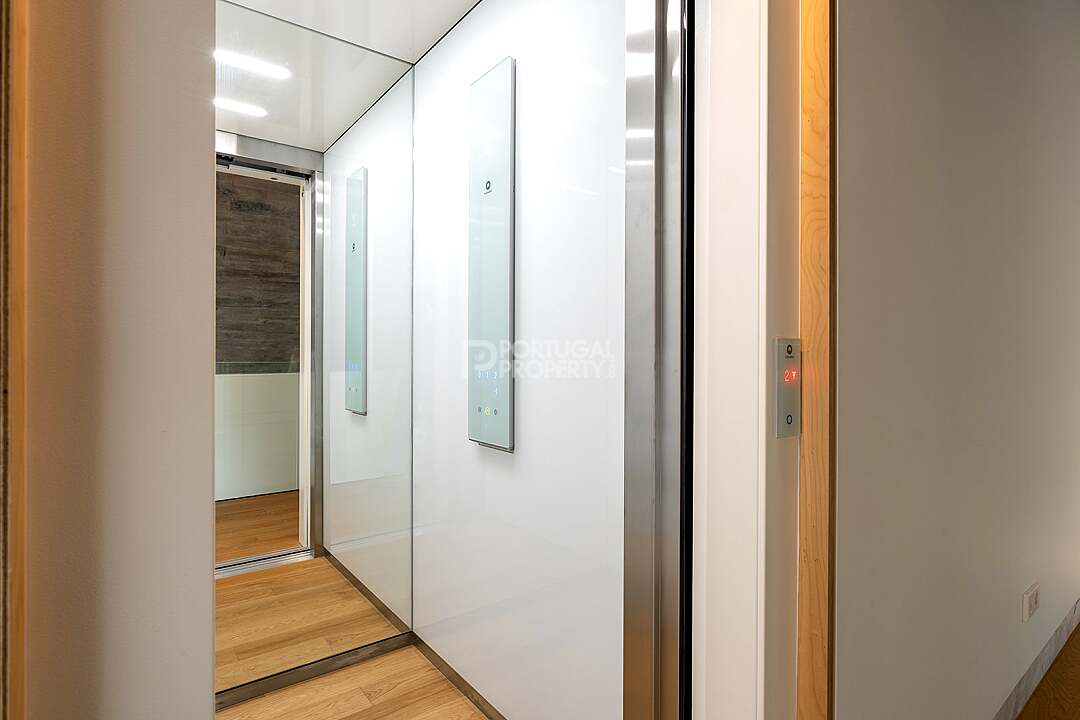 This unit is a V4+1, modern design, with 351 m2 of gross area, a triplex with a private elevator on all floors, a private garden of 127 m2, 23 m2 of terraces with an amazing sea view, and 4 large, private, underground parking spaces with direct and private access to the house.