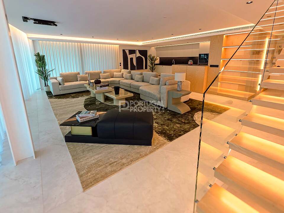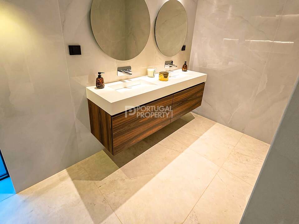 On the other floor, there is a large living room and kitchen, also open-plan, and a suite. This floor features a heated swimming pool with a water cascade, an outside barbecue and a kitchen too. It has private access from the street/garage, but also access to the upper floor, offering complete privacy. The entire house is finished with materials of the highest quality.