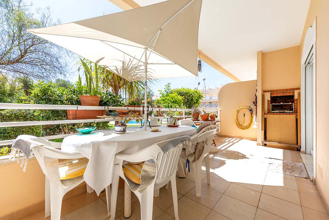 The spacious, private terrace with a built-in barbecue can accommodate a family-sized table and chairs for outdoor dining and entertaining.