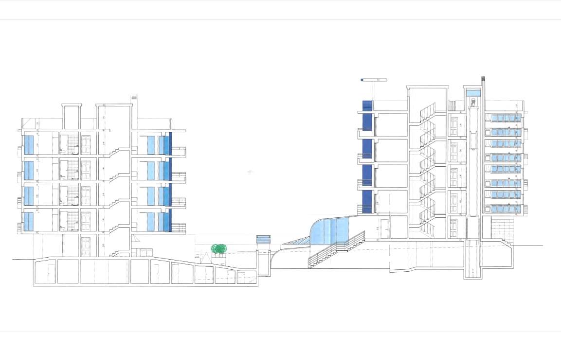In the underground garage, there are parking spaces and storage rooms and access to the apartments by elevators.