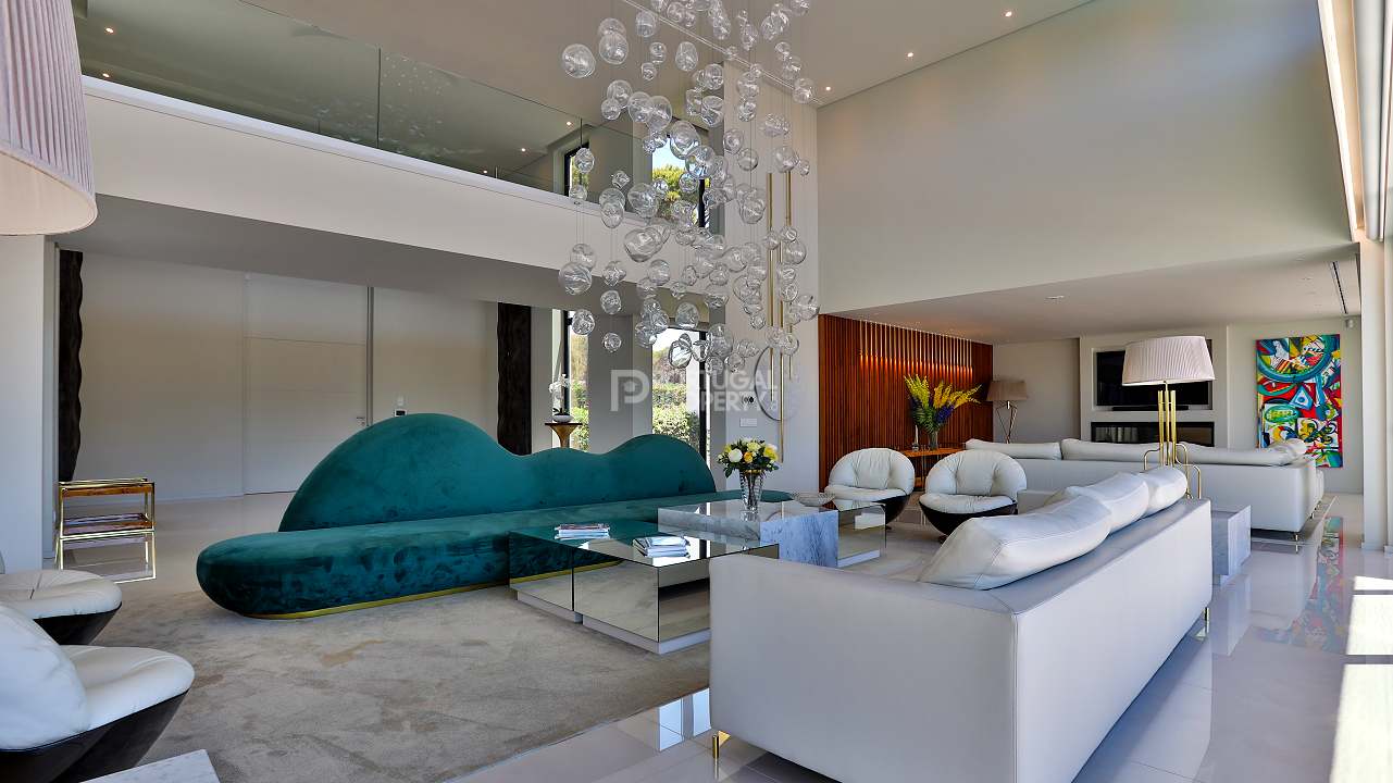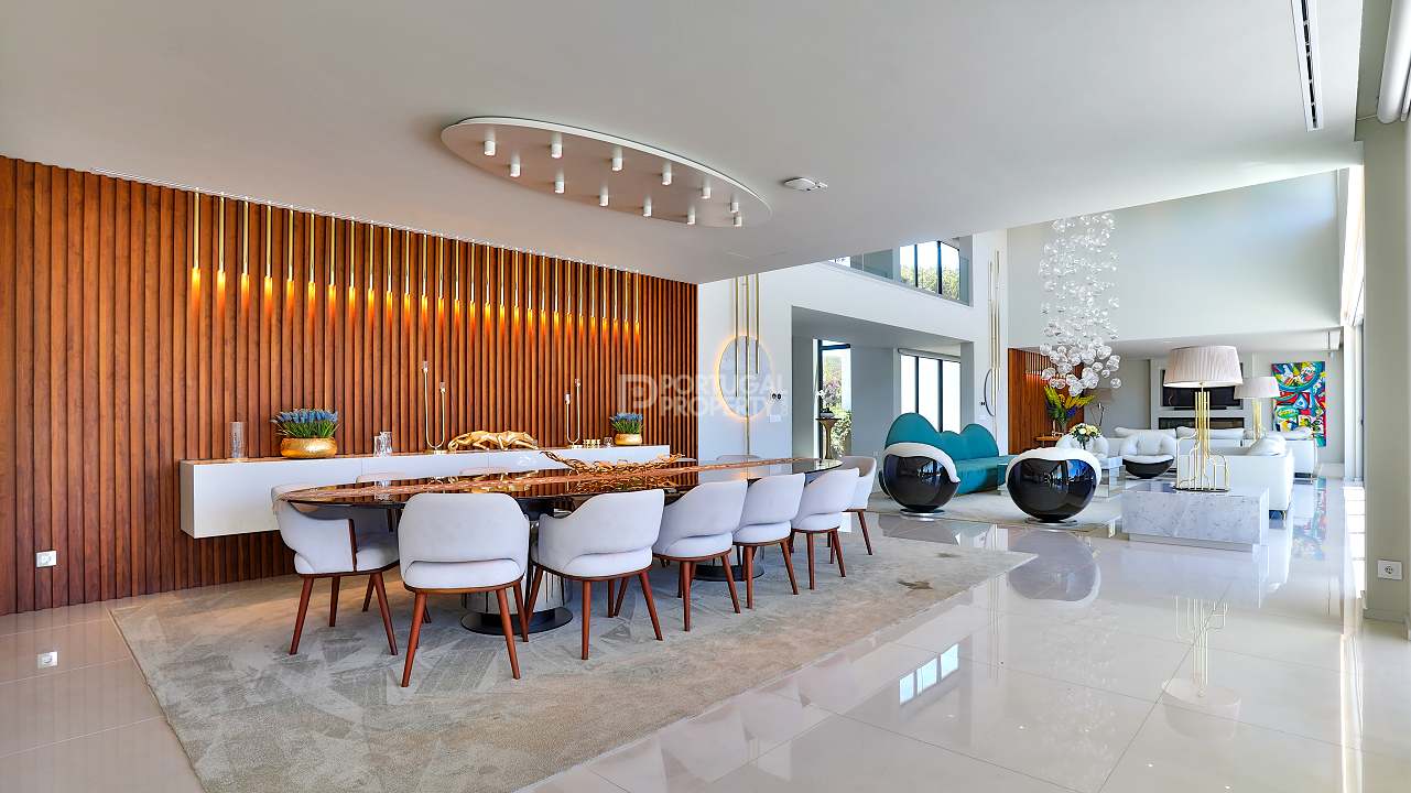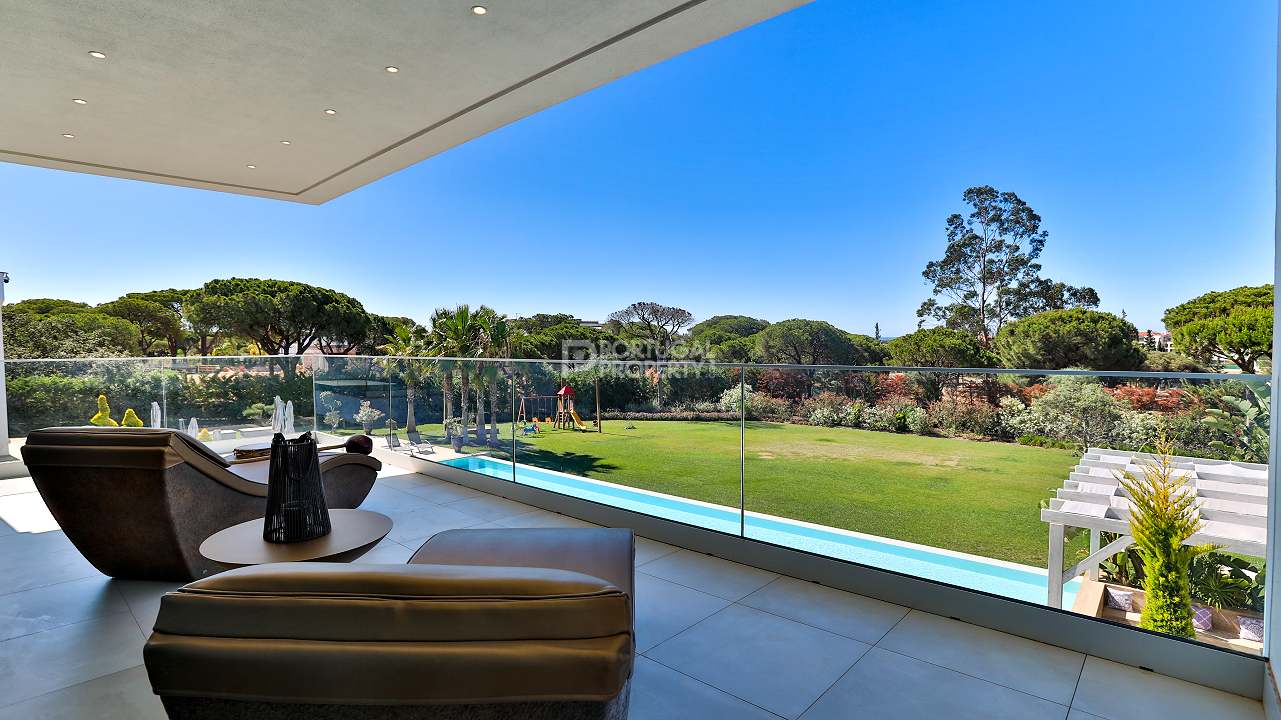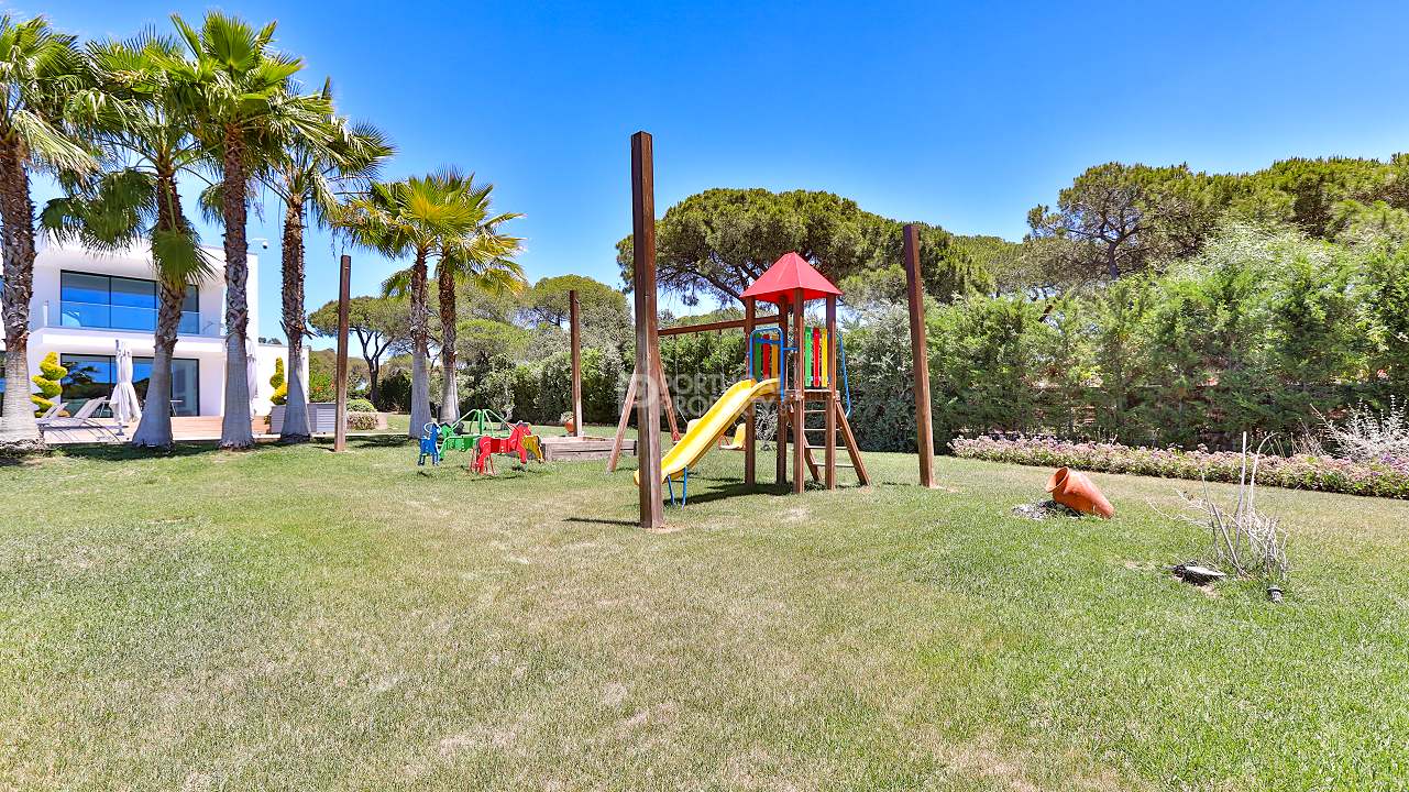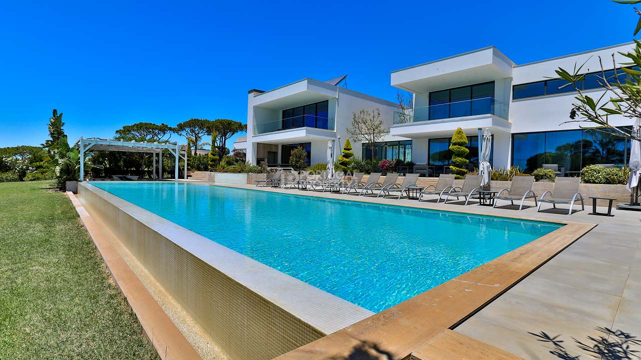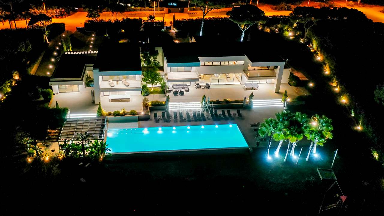 Discover unparalleled luxury in the esteemed Pinhal Velho area of Vilamoura with this exquisite villa, a 2020 masterpiece from SMS Arquitectos. Nestled on a sprawling 6,859 m2 plot, this 956.5 m2 property boasts 8 elegant bedrooms and 10 lavish bathrooms. The villa's architectural brilliance is matched by its sophisticated interiors, including a double-height lounge, a cosy TV room with a gas fireplace, and a grand dining area seating 20. Seamless outdoor integration highlights a stunning adult and children's swimming pool, a BBQ-equipped covered terrace, and a delightful children's playground amidst picturesque gardens.