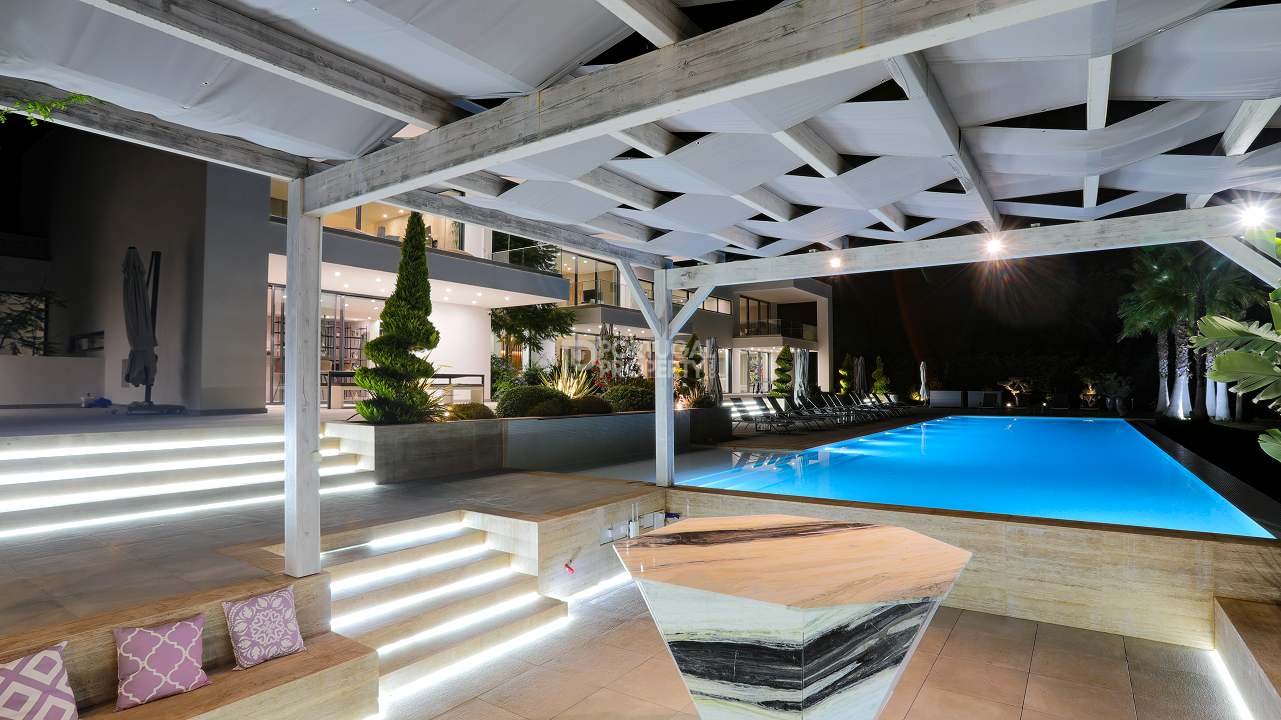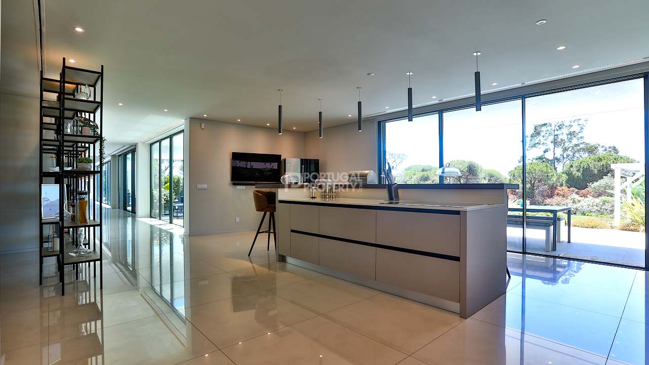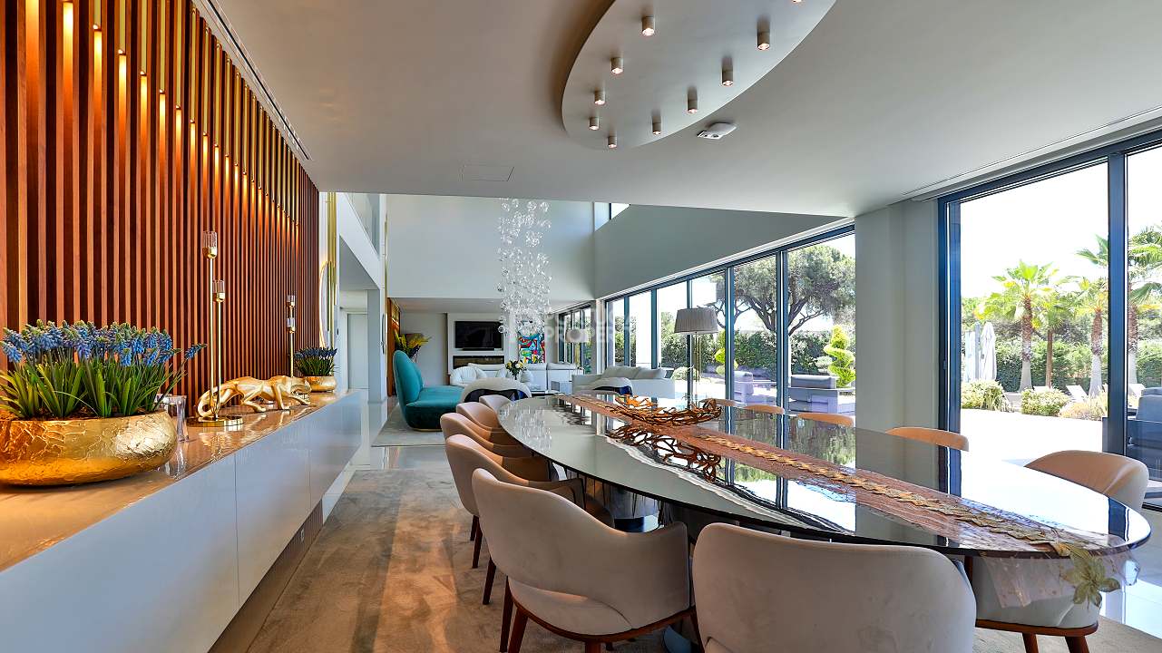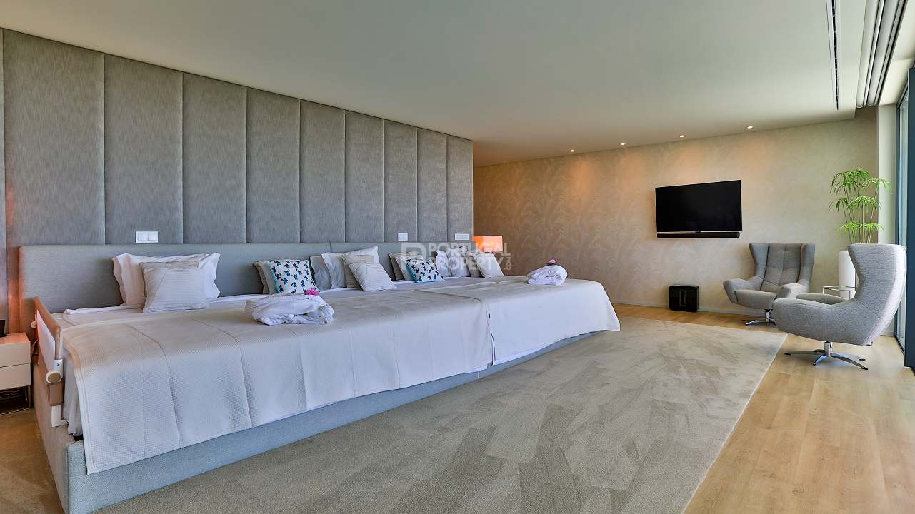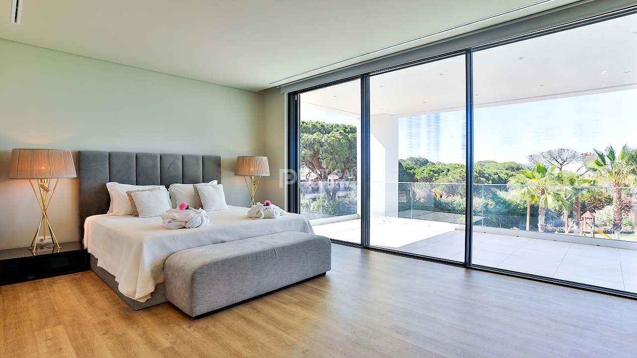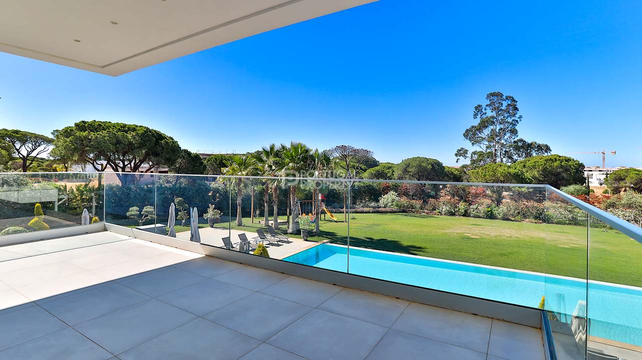 Discover unparalleled luxury in the esteemed Pinhal Velho area of Vilamoura with this exquisite villa, a 2020 masterpiece from SMS Arquitectos. Nestled on a sprawling 6,859 m2 plot, this 956.5 m2 property boasts 8 elegant bedrooms and 10 lavish bathrooms. The villa's architectural brilliance is matched by its sophisticated interiors, including a double-height lounge, a cosy TV room with a gas fireplace, and a grand dining area seating 20. Seamless outdoor integration highlights a stunning adult and children's swimming pool, a BBQ-equipped covered terrace, and a delightful children's playground amidst picturesque gardens.