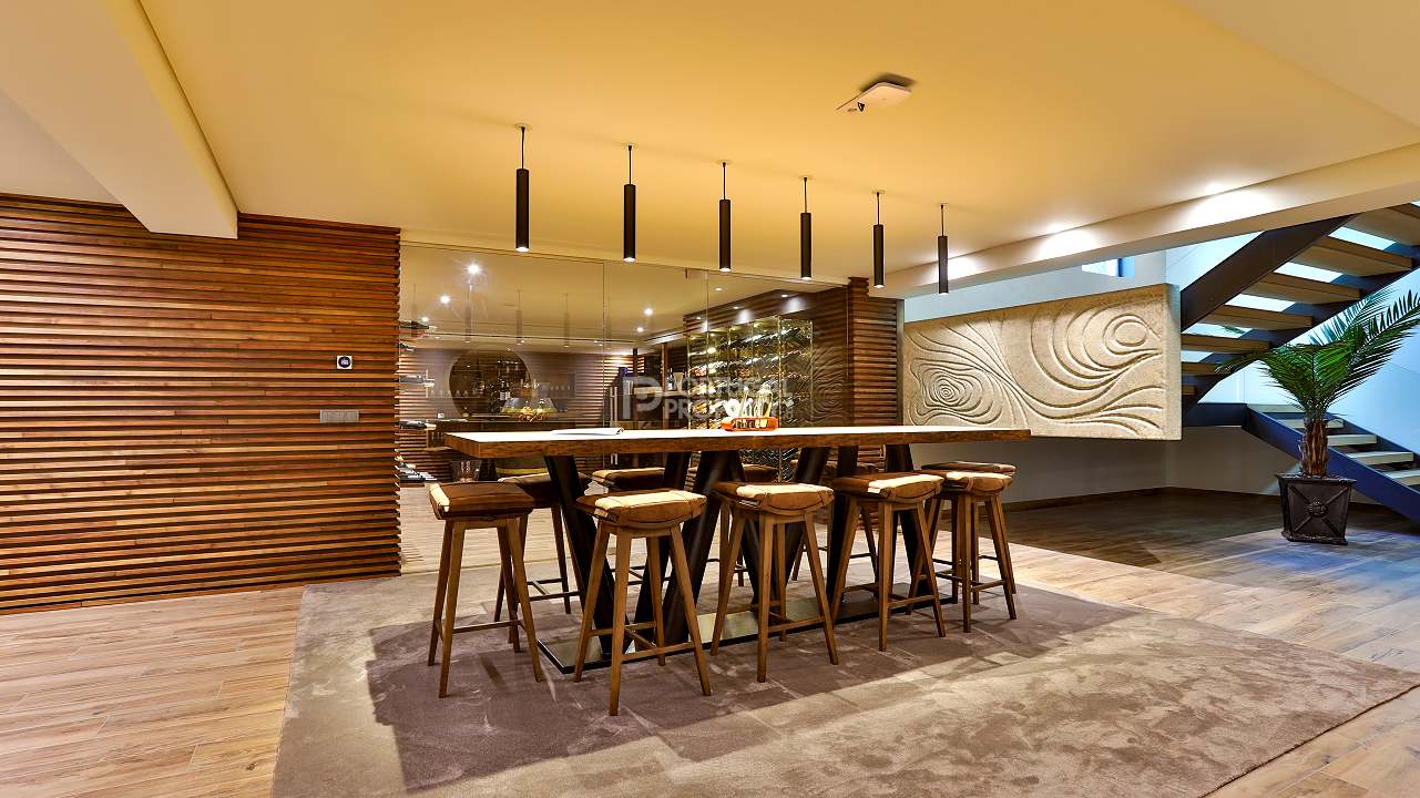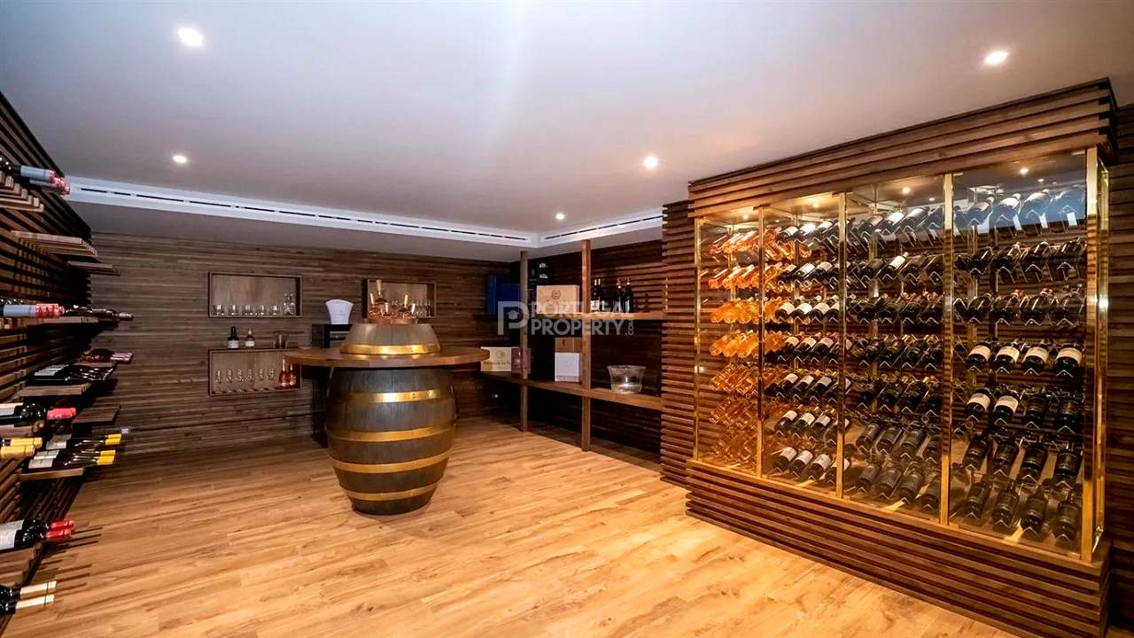 The basement is a haven of entertainment and relaxation, featuring 2 en-suite bedrooms, an additional TV and games room, a steam room, a private gym, a chic wine cellar, and a bar. Practicalities are covered with ample storage and a 4-car garage. Luxury flows through each level, with bespoke bathrooms and built-in wardrobes in every bedroom. The master suite is a sanctuary with a spacious walk-in closet, a private balcony, and a custom bed.
