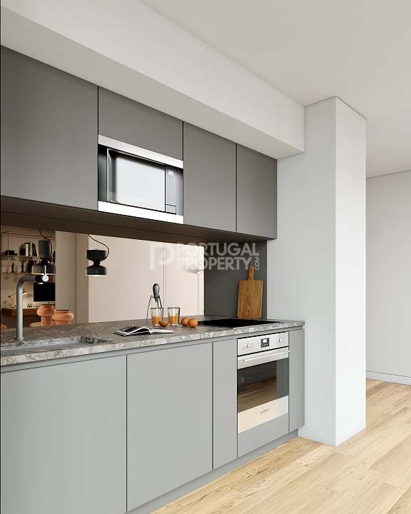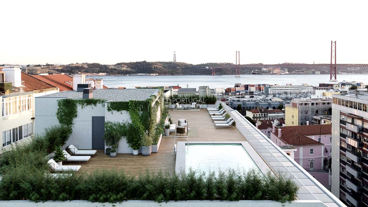The project consists of 33 apartments over 9 floors. The range of apartments is from 1-bed through to 3-beds, with some units having exterior space, and many having views of the river. There is a communal rooftop terrace with a pool which covers the full roof and offers spectacular views of the river Tejo and Lisbon´s famous bridge.