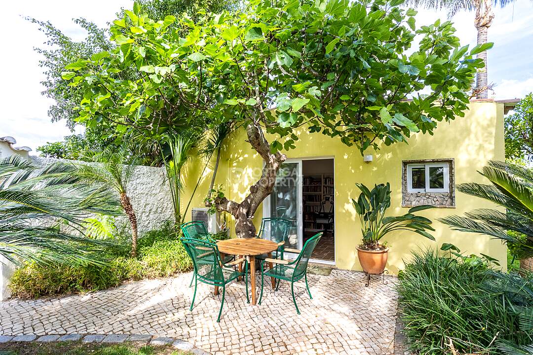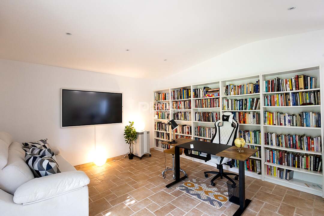 Within the main house, one of the annexes offers an open-concept living and dining area, alongside a fitted kitchen, two bedrooms, and a bathroom. The second annexe, a detached structure, showcases a studio equipped with a kitchenette, currently serving as a library.