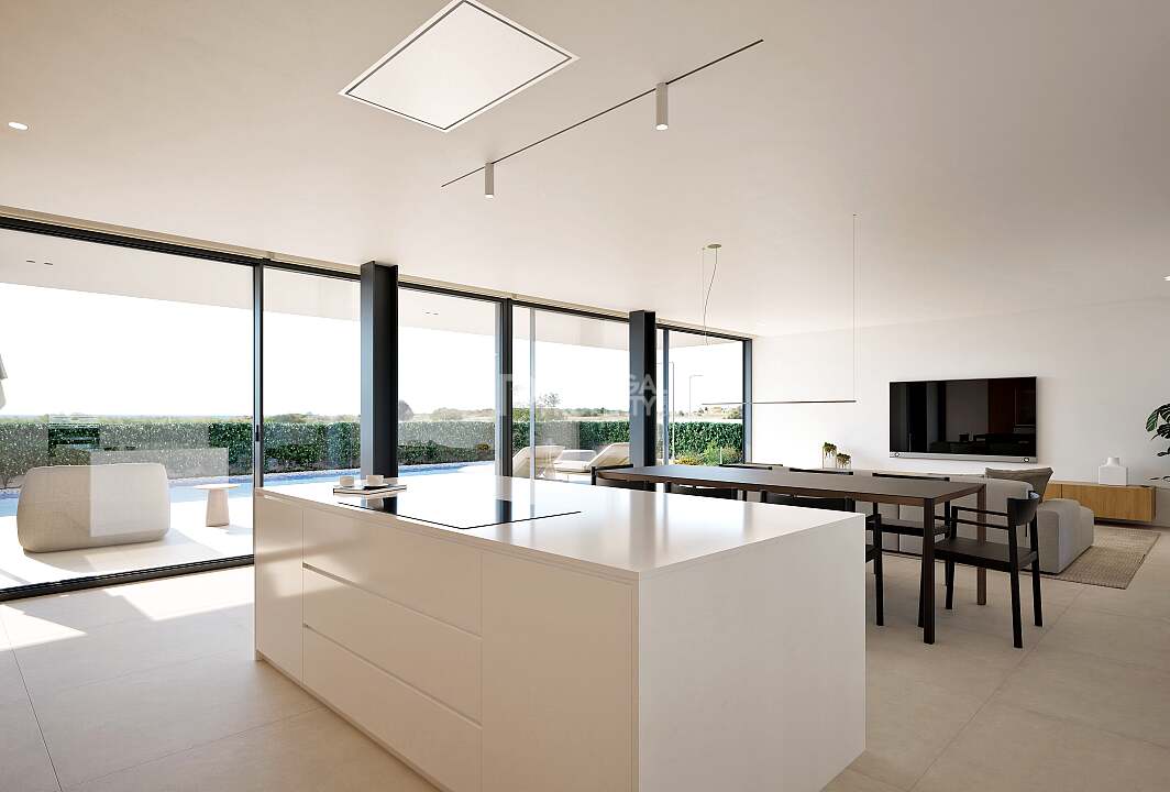 The ground floor consists of a large open-plan living/dining and kitchen area with patio doors leading out to the south-facing pool terrace and gardens. There is a separate utility room and a guest bathroom with stairs or elevator to the first floor.