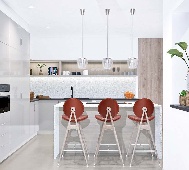 Large living/dining area with patio doors leading out onto the south-facing sea-view terrace, and a covered dining area. A separate, fully-fitted quality kitchen also has access to the outside terrace.