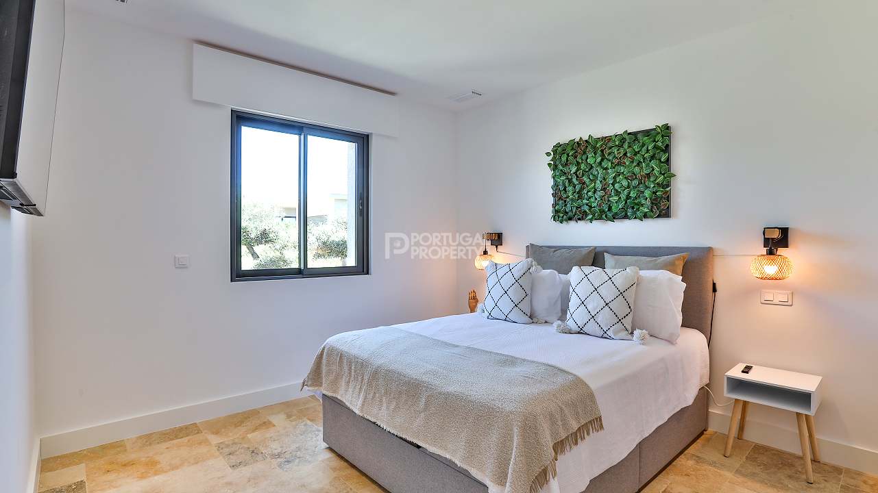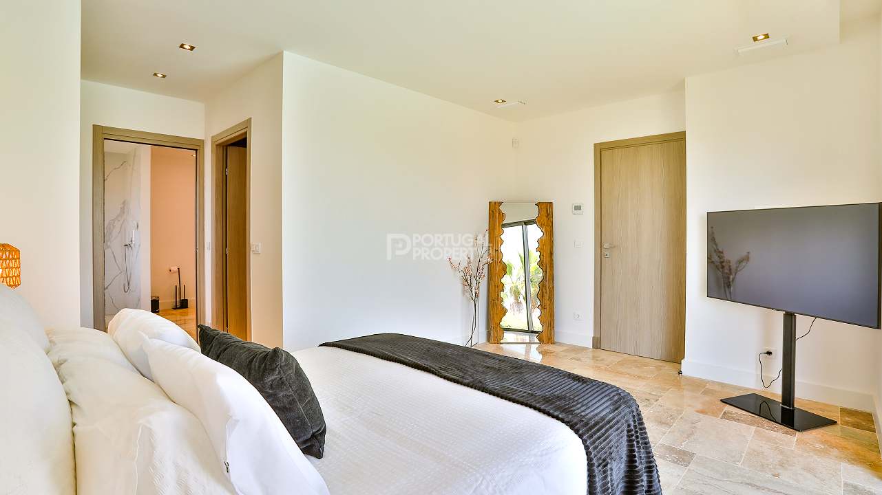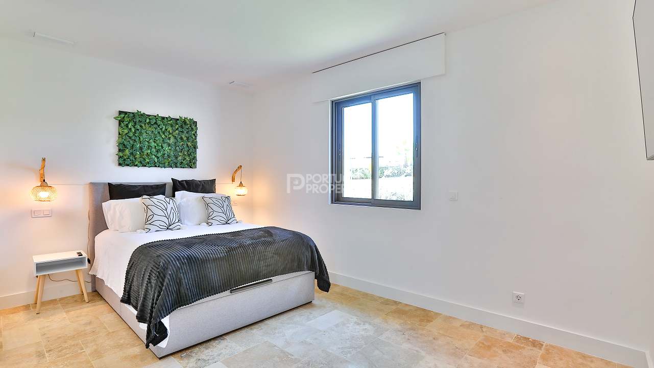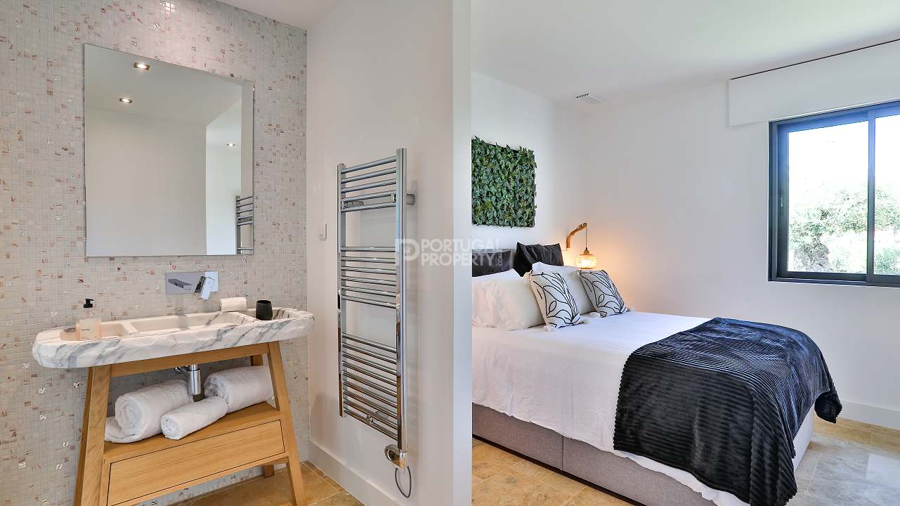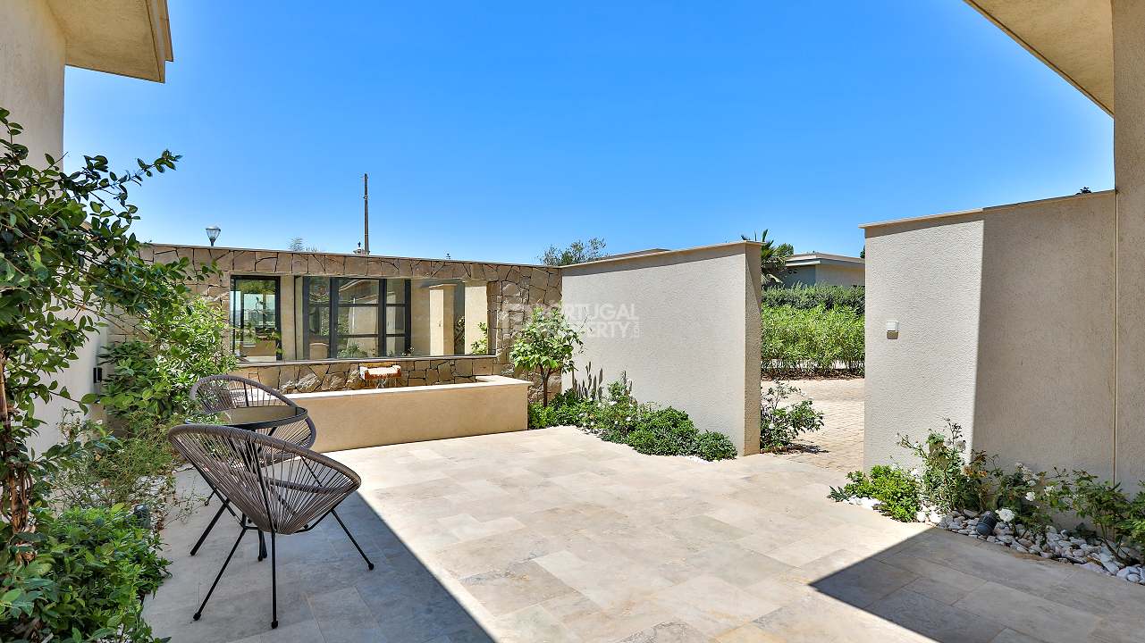 Outdoors, the Algarve lifestyle comes into focus. A white heated pool, protected by a simple cover, invites swimming in every season. The courtyard, centred on a gentle fountain, offers a pocket of stillness for reading, conversation or evening air.