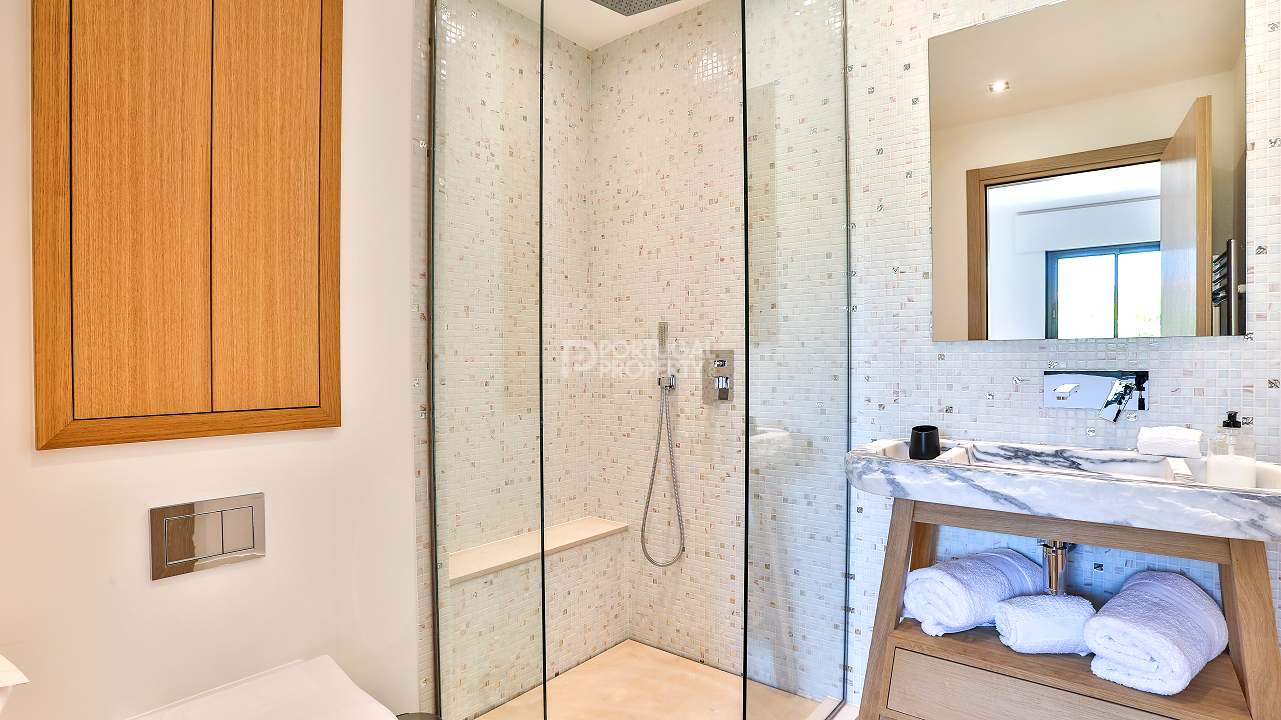 The two additional bedrooms each have built-in wardrobes and their own en-suites, giving family and guests independence and comfort. Shutters here, too, ensure privacy and rest.