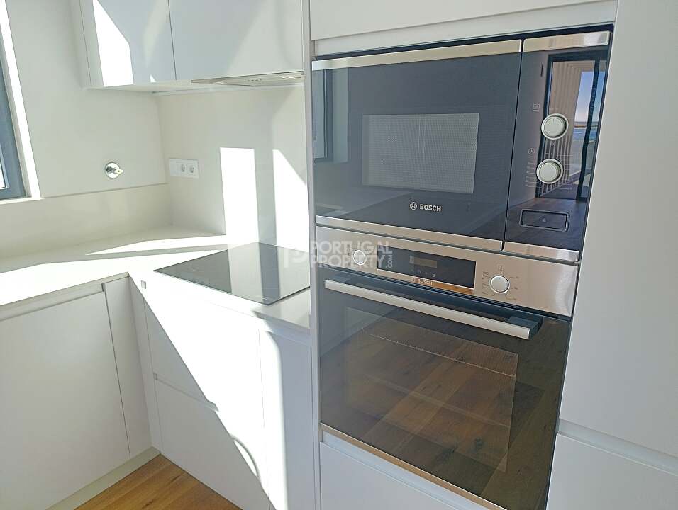 Kitchens are equipped with state-of-the-art Bosch appliances, including a microwave, oven, induction hob, and more. Elegant white thermo laminate cabinets with hidden handles and white Silestone countertops enhance the modern design.