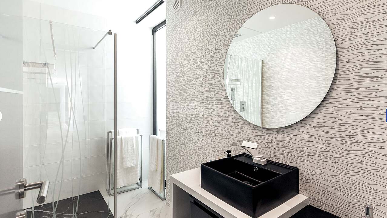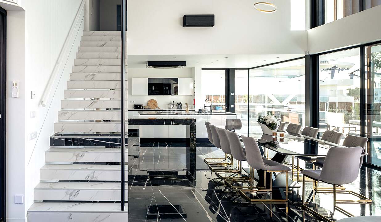 As you enter, you’re greeted by an open-plan living and dining area bathed in natural light, highlighted by an elegant double staircase and expansive sea views. Large windows open to reveal a vast saltwater pool and outdoor leisure areas, while the fully equipped gourmet kitchen adds a touch of luxury to everyday living. The ground floor also features a spacious en-suite bedroom for convenience.