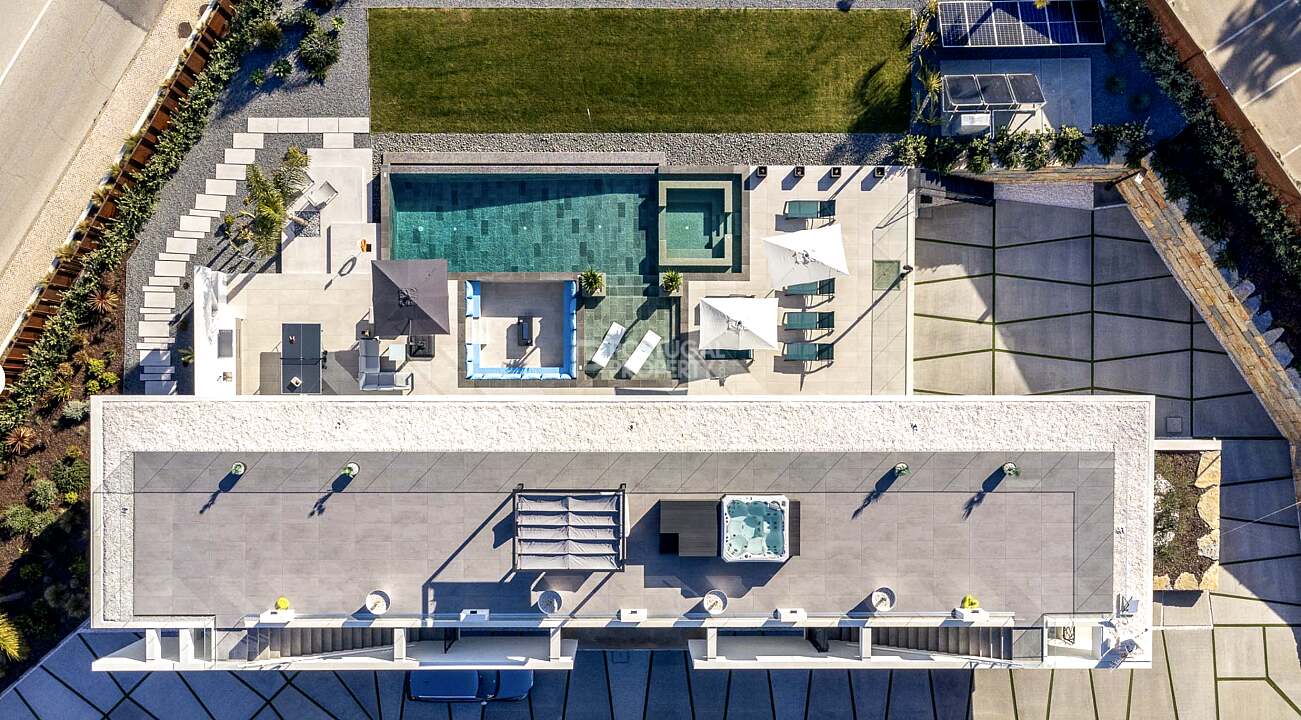 A separate lower-level gym offers a private fitness space, and the property provides parking for up to eight vehicles. Equipped with underfloor heating, air conditioning, smart home technology, and electric shutters, this villa ensures both comfort and modern convenience.