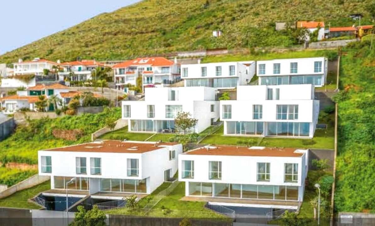 This set of villas is located in the parish of São Martinho, municipality of Funchal, in a tourist area, where its surroundings are dominated by hotels, accommodation and some commercial units. The area is served by good pedestrian and road accessibility, as well as public transport. Architecture The "Casas Brancas" development is located on a rectangular geometric plot of land, with about 3,322 m2. From the implantation, a better optimization and use of the morphology of the land was sought, with the aim of improving not only the use of this space but also creating new and correct street fronts with an adequate scale. For this to happen, it was decided to maintain the morphology of the land in the areas that flank the building bodies, implanted at predominant level levels, thus leaving the rest of the land as natural as possible.
