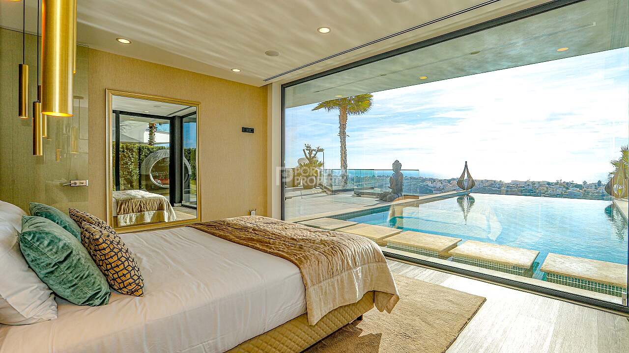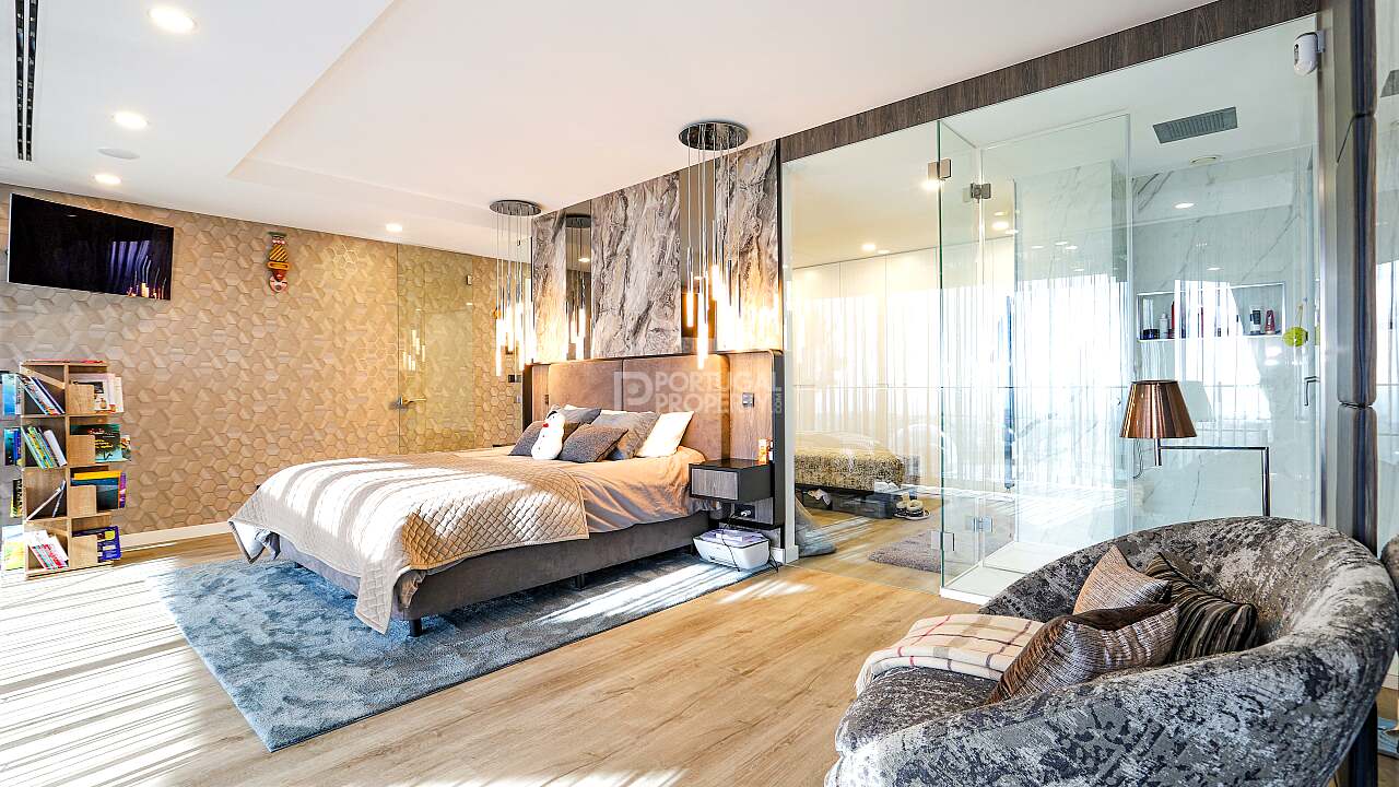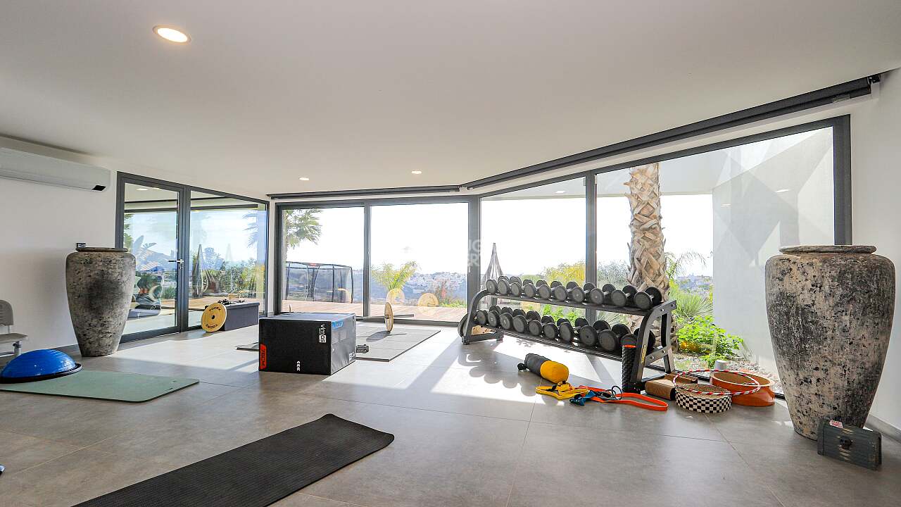 Nestled in the quiet hills of Cerro de Águia and overlooking the surrounding landscape and the newly constructed marina, this ultra luxury villa is a statement of contemporary architecture and coastal living. Set across three levels, the residence is arranged as a four suite home with fitted wardrobes, with both the principal suite and the main guest suite directly sea facing. The ground floor flows from a fully equipped kitchen into a spacious lounge that opens to terraces and the private pool for seamless indoor to outdoor living. The lower level is a large, flexible space curated as a cinema and games room with a compact gym that frames the ocean view. This entire level can be converted into a fifth suite if desired, adding guest capacity while preserving family space.