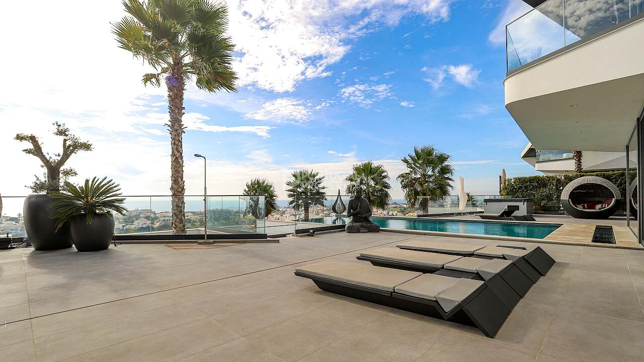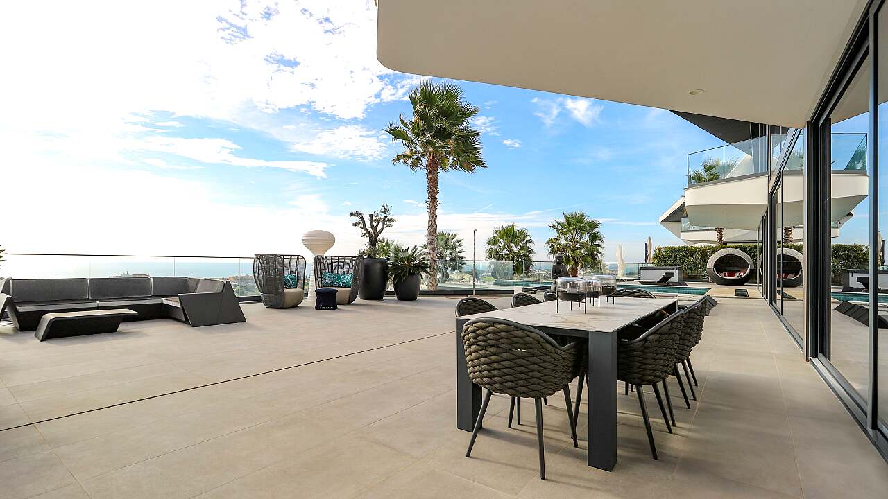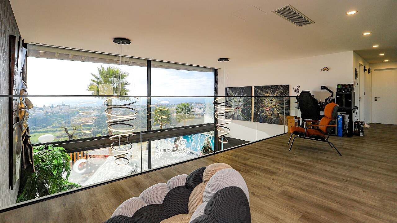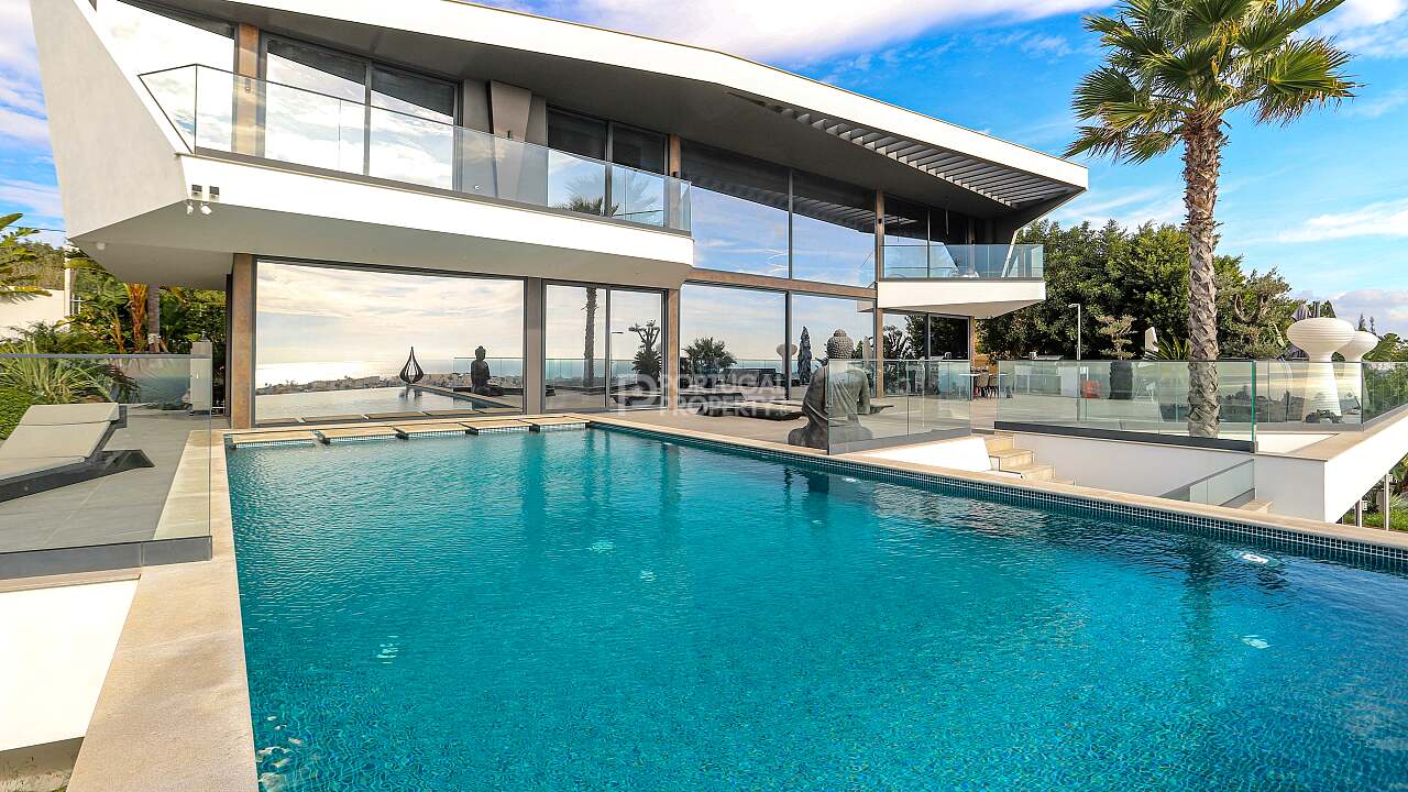 Nestled in the quiet hills of Cerro de Águia and overlooking the surrounding landscape and the newly constructed marina, this ultra luxury villa is a statement of contemporary architecture and coastal living. Set across three levels, the residence is arranged as a four suite home with fitted wardrobes, with both the principal suite and the main guest suite directly sea facing. The ground floor flows from a fully equipped kitchen into a spacious lounge that opens to terraces and the private pool for seamless indoor to outdoor living. The lower level is a large, flexible space curated as a cinema and games room with a compact gym that frames the ocean view. This entire level can be converted into a fifth suite if desired, adding guest capacity while preserving family space.