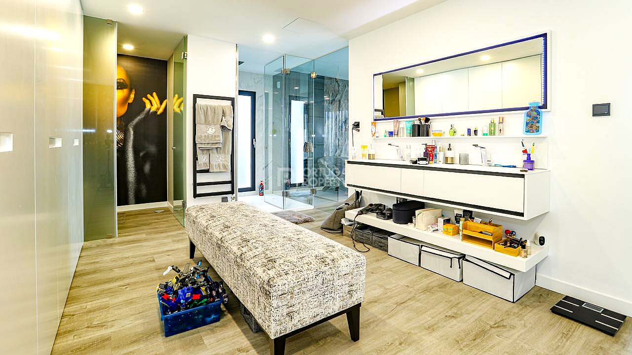 Comfort and technology lead the specification. A state of the art home automation system manages climate and lighting, while solar panels, air conditioning and water based underfloor heating ensure year round comfort throughout. The technical file records a Daikin Altherma heat pump for domestic hot water and underfloor heating, complemented by Daikin split and multi split air conditioning and solar thermal collectors that meaningfully reduce day to day energy demand. The energy certificate SCE203960828 is valid to 24 June 2029 and notes an estimated seventy four percent renewable contribution with approximately 1.62 tonnes of CO₂ per year, a strong result for a home of this scale.