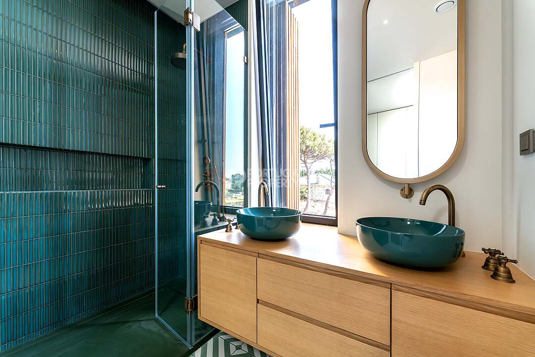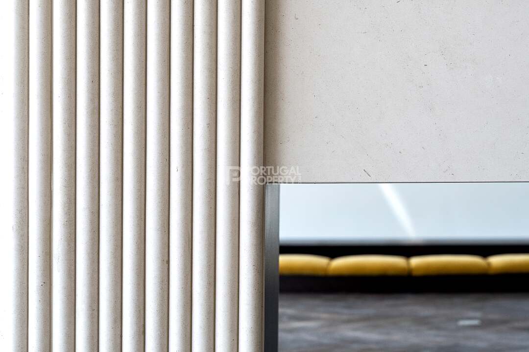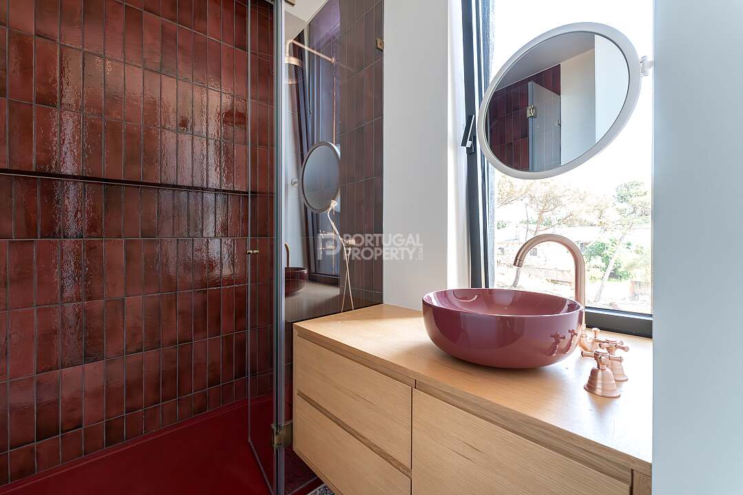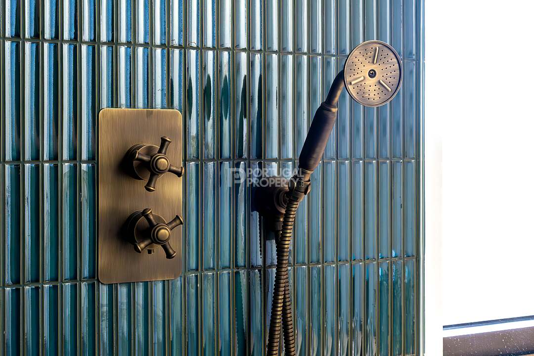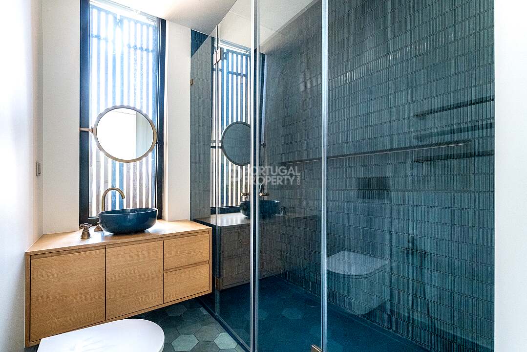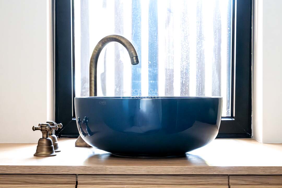 In the social bathroom, light reflects off the artistic pieces by the talented Bela Silva, crafted with the artistry and expertise of Viúva Lamego, adding a special and delicate touch. The open-plan kitchen, equipped with the most modern solutions, features a sliding door system that provides privacy when desired, keeping all spaces airy and free of clutter.