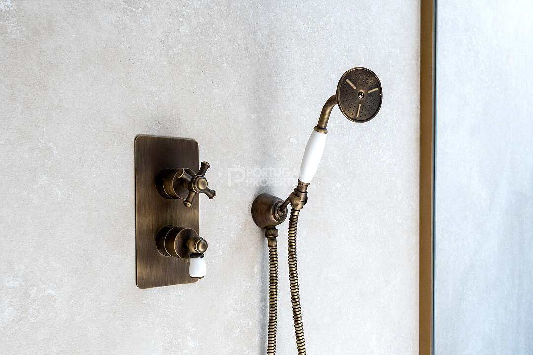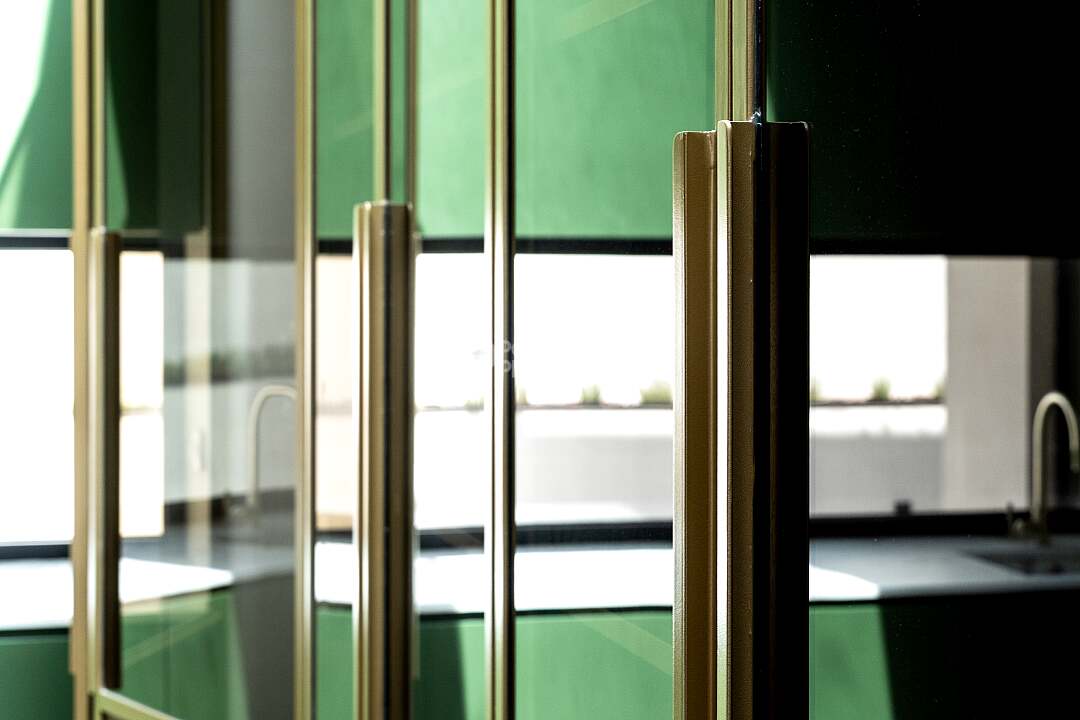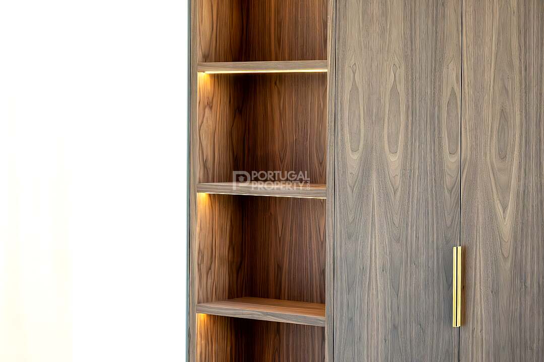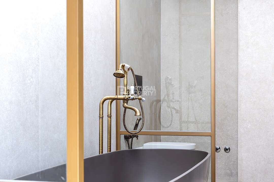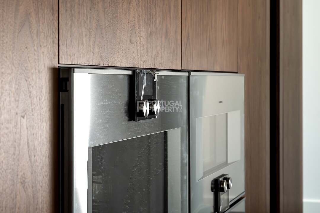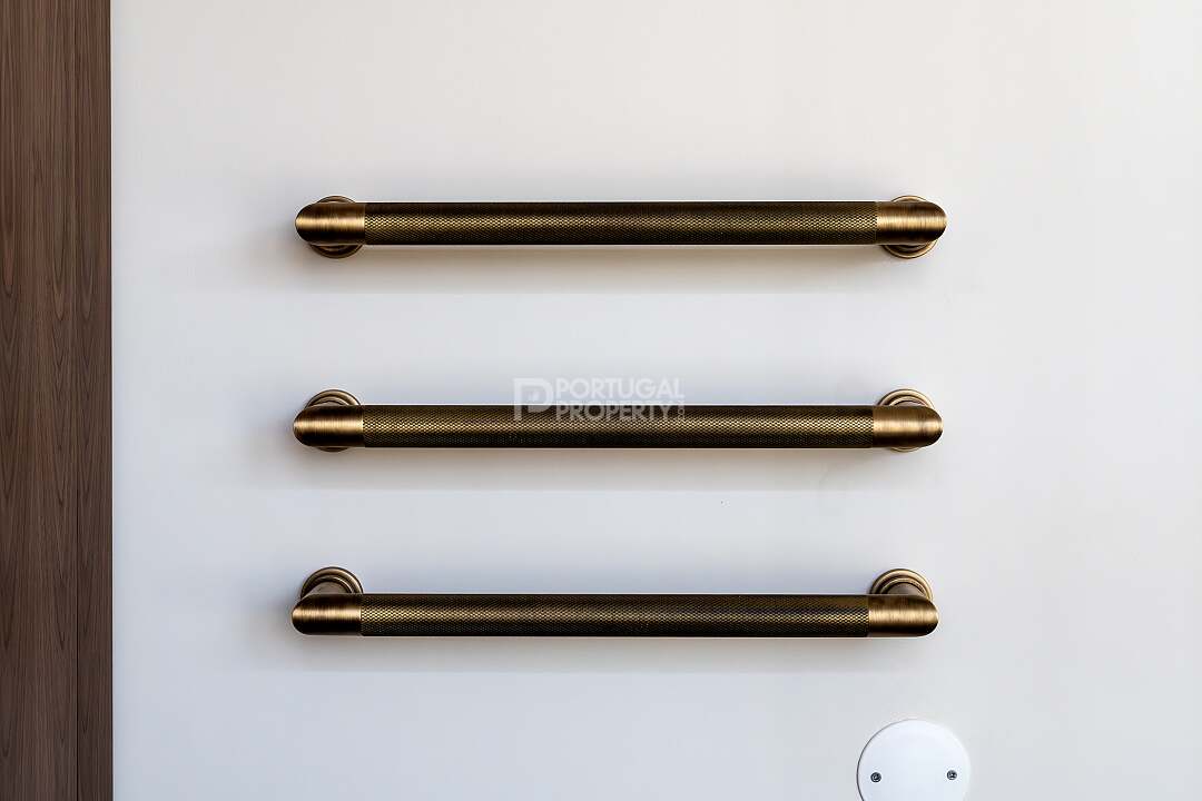 In the social bathroom, light reflects off the artistic pieces by the talented Bela Silva, crafted with the artistry and expertise of Viúva Lamego, adding a special and delicate touch. The open-plan kitchen, equipped with the most modern solutions, features a sliding door system that provides privacy when desired, keeping all spaces airy and free of clutter.
