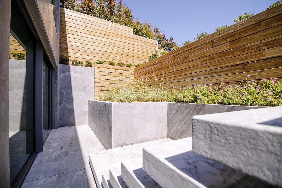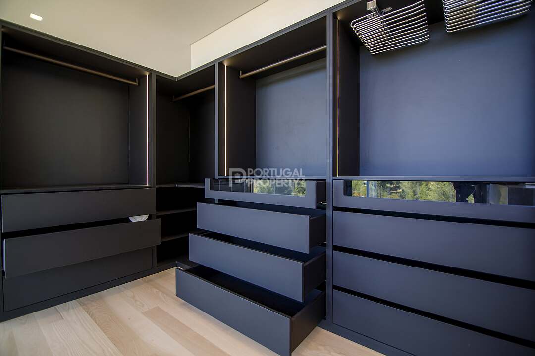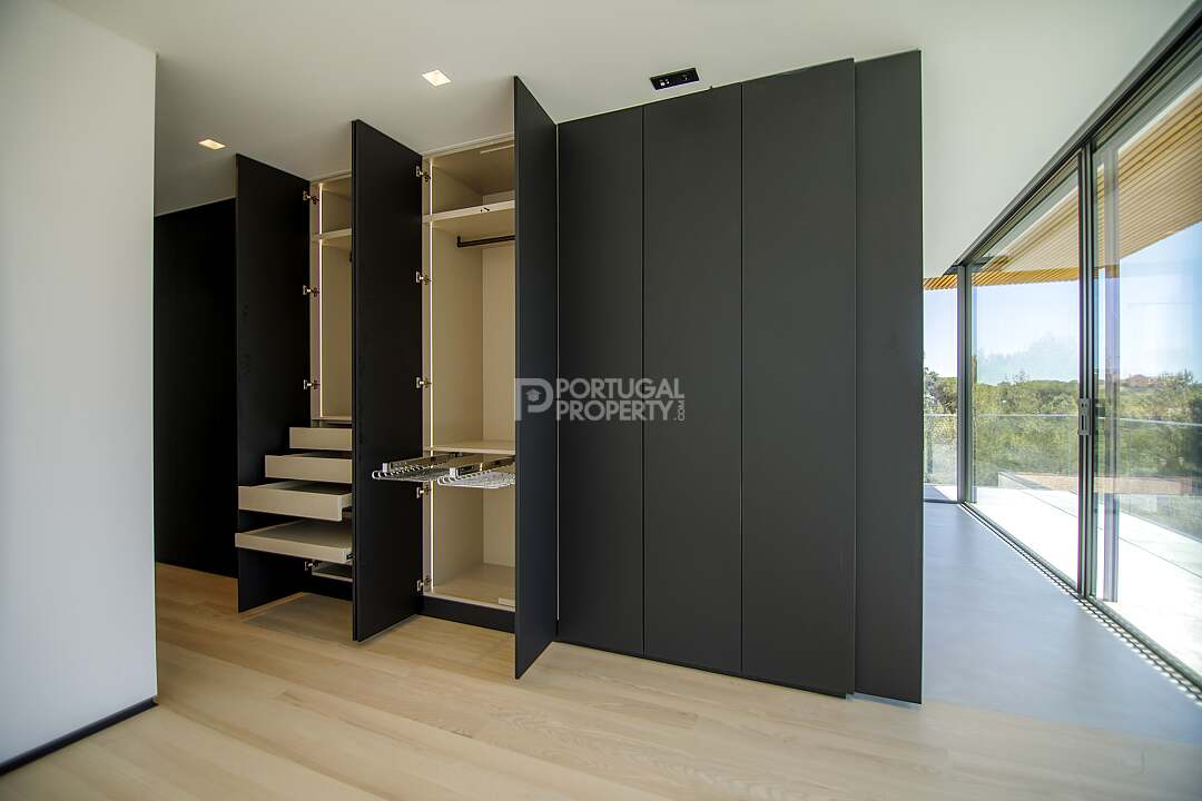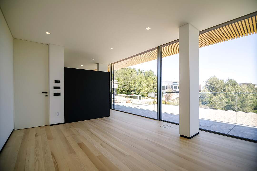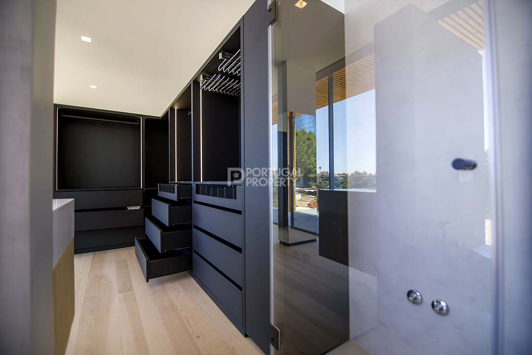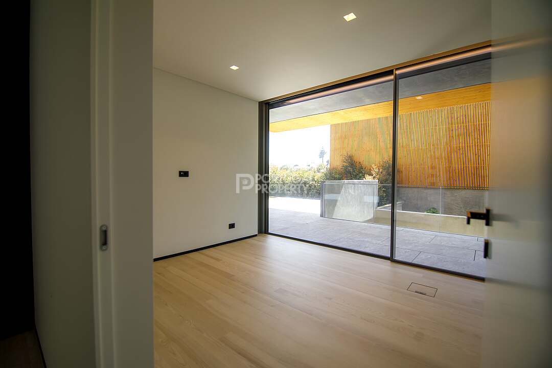 Upstairs, the first floor offers three generously sized suites. The master suite, facing south, includes a refined walk-in closet and a private terrace where the sun lingers. Another suite faces west and also features a walk-in closet, while the third suite, facing east, includes spacious built-in wardrobes. Each suite has been designed as a personal retreat of light, quiet, and elegance.