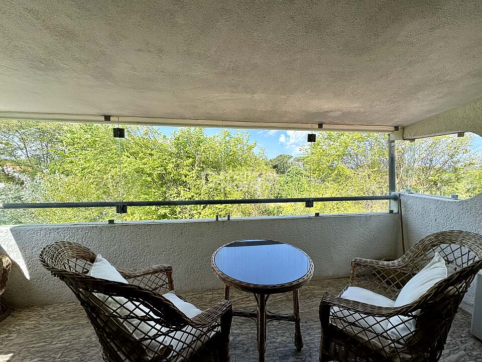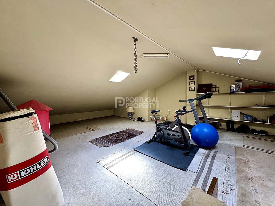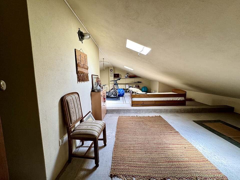 Upstairs, the attic space (approx. 30 m² / 323 sq ft) is fully finished and includes a large bedroom area with direct access to a covered balcony facing the treetops and sea in the distance, a bathroom, several built-in closets, and a multipurpose area currently used as a home gym.