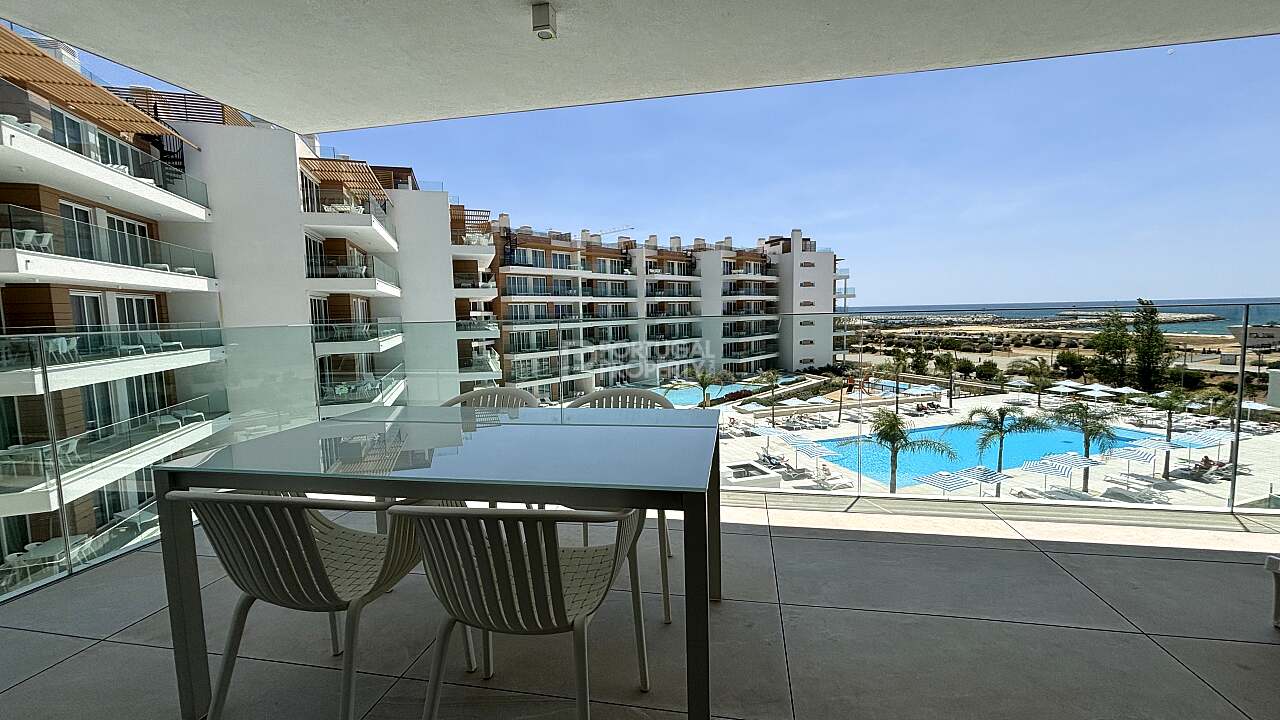 This apartment features a spacious open-plan living area and a fully equipped modern kitchen that opens onto a generous balcony with panoramic sea views. The two large bedrooms include built-in wardrobes and a walk-in closet in the master suite, both offering balcony access and sea views.