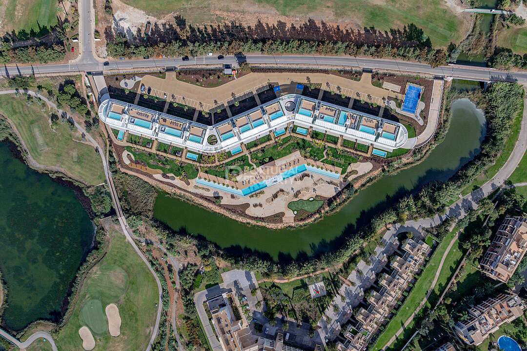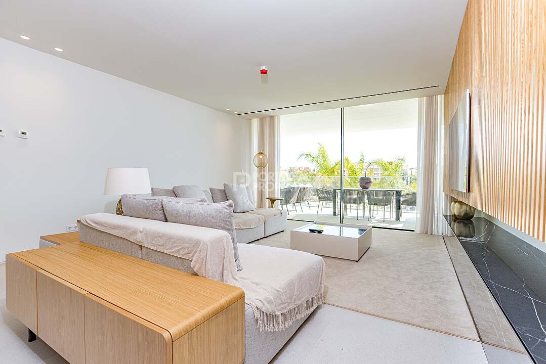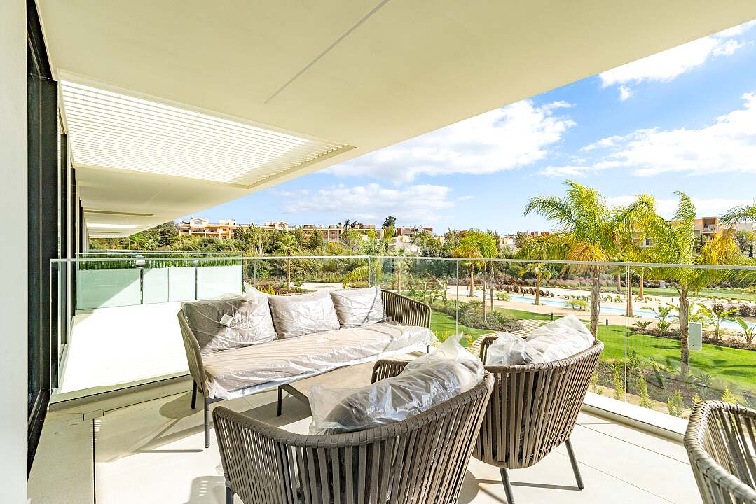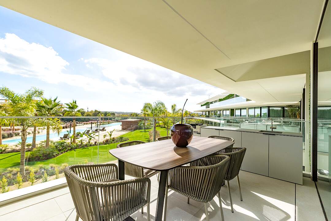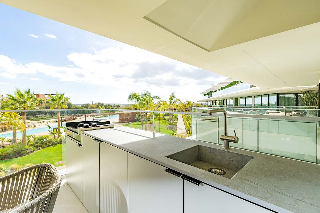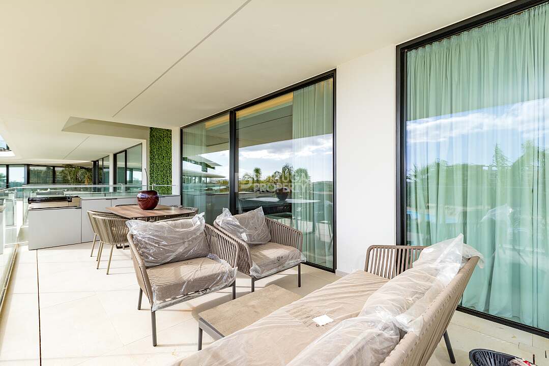 Both bedrooms feature en-suite bathrooms appointed with Hansgrohe fixtures and handcrafted tiles, with the master suite opening to a private terrace that captures breathtaking sunset views over the fairways. The expansive main terrace, accessible from the living area, creates a seamless indoor-outdoor living experience perfect for entertaining or private reflection.