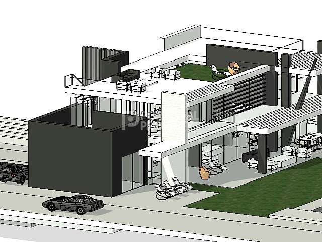 Upstairs, elegant bedrooms feature bespoke white-lasered wardrobes with linen-lined interiors. Bathrooms are finished to a spa-like standard with Marazzi tiles rising to 2.7 m and premium Porcelanosa fixtures. The master suite enjoys panoramic glazing and private outdoor terraces, enhanced by sleek horizontal window blades that provide both privacy and sun control.