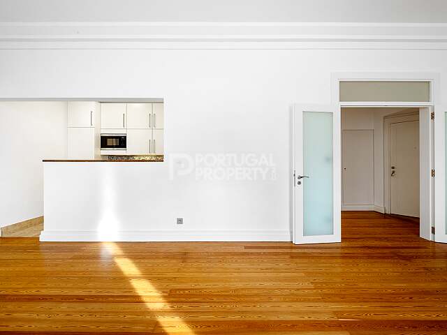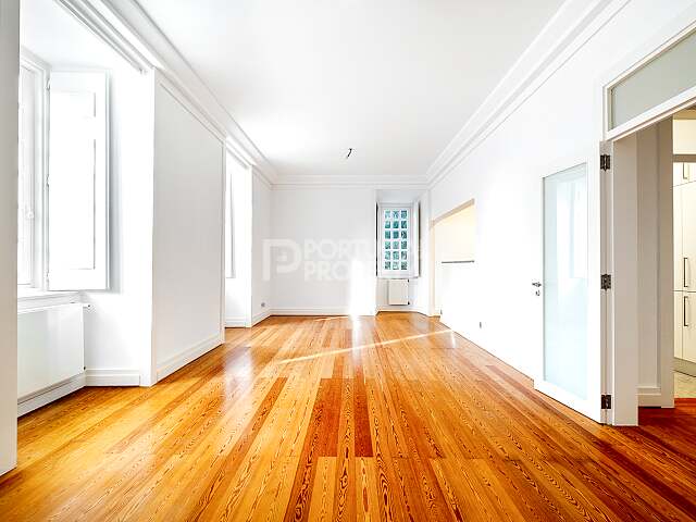 This spacious apartment features a bright living room with direct access to the terrace, a fully equipped kitchen with Miele appliances, and a bedroom suite with built-in wardrobes. High-quality finishes include solid wood window frames with double glazing and wooden shutters, lovely wood flooring, Lioz stone countertops and flooring in the kitchen and bathroom, Viúva Lamego tiles in the bathroom, original Convent tiles on the kitchen backsplash, central heating, pre-installation for air conditioning, electric towel warmer and a reinforced security door.