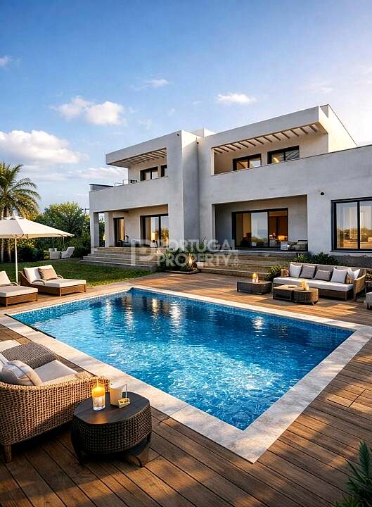 This contemporary white minimalist villa is a newly built property located in the peaceful residential area of São Bartolomeu do Sul, offering open countryside views, excellent sun exposure and easy access to beaches, golf courses and Spain.