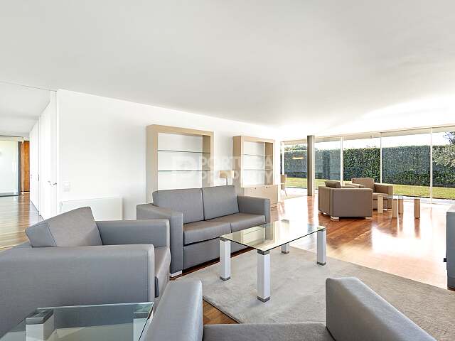 At the heart of the house is the “Meeting Room” patio, a peaceful interior space designed for contemplation and relaxation, serving as a natural extension of the living area. For those who value an active lifestyle, the property includes a golf course and tennis courts with pay-per-use access, a full-size football field available for free, and a fully equipped gym.