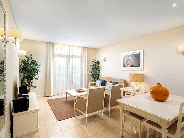 The apartment is fully furnished and equipped, featuring an open-plan living and dining area, air conditioning, underfloor heating, and seamless access to the spectacular terrace.