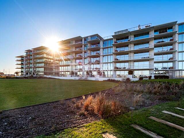 A fifth-floor two-bedroom apartment within Bayline, one of the Algarve’s most recent beachfront developments, delivered in 2023. The property offers lateral sea views, clean contemporary lines, and full-height glazing that draws natural light across the living space.